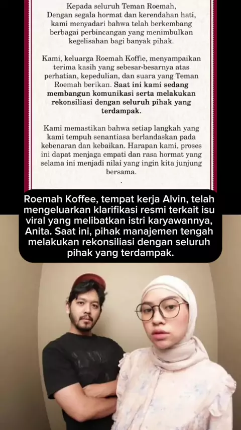 Roemah Koffee, tempat kerja Alvin Harris, telah mengeluarkan klarifikasi resmi terkait isu viral yang melibatkan istri karyawannya, Anita. Saat ini, pihak manajemen tengah melakukan rekonsiliasi dengan seluruh pihak yang terdampak #petugaskai #alvinhrrs #agribudiansyah #anitadipecat #anitadewl