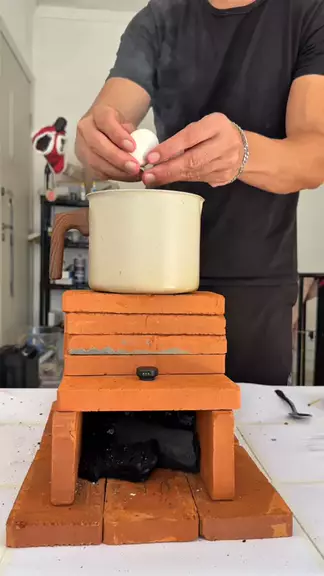 Ele fez um mini fogão com tijolos