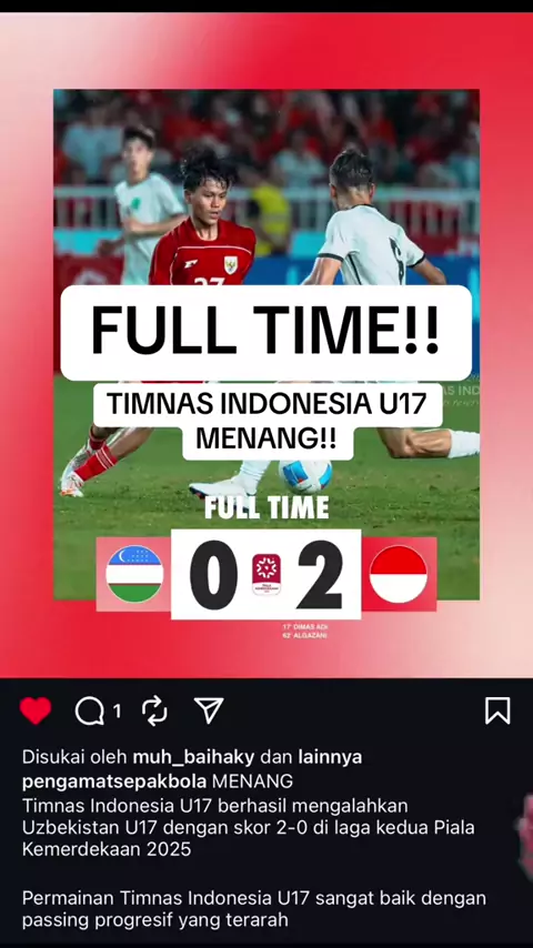 FULL TIME!! TimNas Indonesia U17 berhasil meraih kemenangan atas Uzbekistan di laga kedua Piala Kemerdekaan 2025 dengan skor 2-0. LETโS GO GARUDA MUDA!! BRAVO TIMNAS INDONESIA ๐ช๐ป๐ฎ๐ฉ๐ฅ #timnasindonesia #timnasu17 #timnasu17indonesia #uzbekistan #fulltime