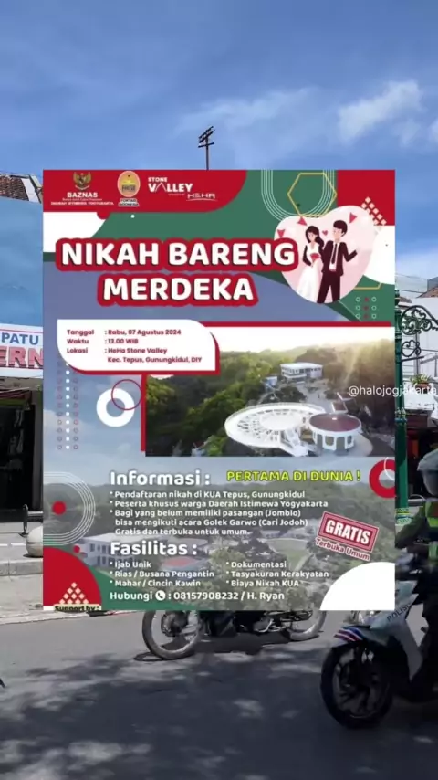 NIKAH BARENG MERDEKA GRATIS‼️Fasilitas ijab, rias, mahar, dokumentasi, syukuran, biaya KUA dan yang jomblo dicarikan jodoh. Tanggal 7 Agustus 2024 mulai pukul 13.00 WIB di HeHa Stone Valley Gunungkidul 👩❤️👨 #halojogjakarta #nikahbareng #eventjogja #gunungkidul
