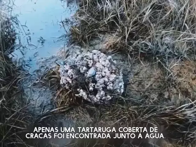 E uma tartaruga coberta de cracas foi encontrada junto à água.