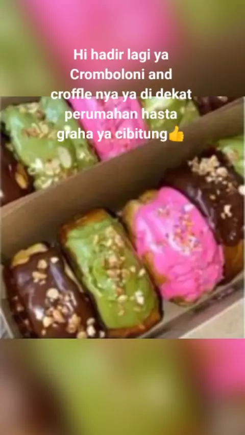 #jalan selang nangka kp selang cau cibitung bekasi,, yuk cobain lagi viral nih murah meriah ko cromboloni harga 12k aja harga satuan nya untuk croffle nya cuma 5k aja satuan nya banyak varian rasa loh samping perumahan hasta graha ya gerbong warna kuning biru oke,, jangan lupa ya......
