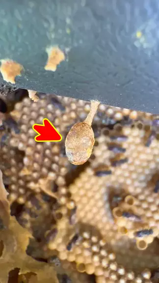 Achei uma célula de cria gigante dentro de uma colônia de abelhas Iraí: uma realeira, da qual surgirá uma futura princesa.