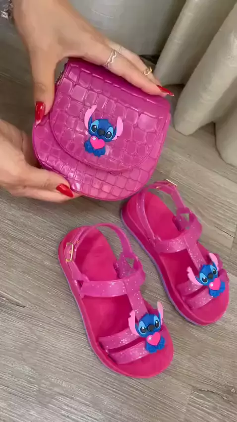kit sandália infantil meninas stitch com bolsinha confortável e antiderrapante