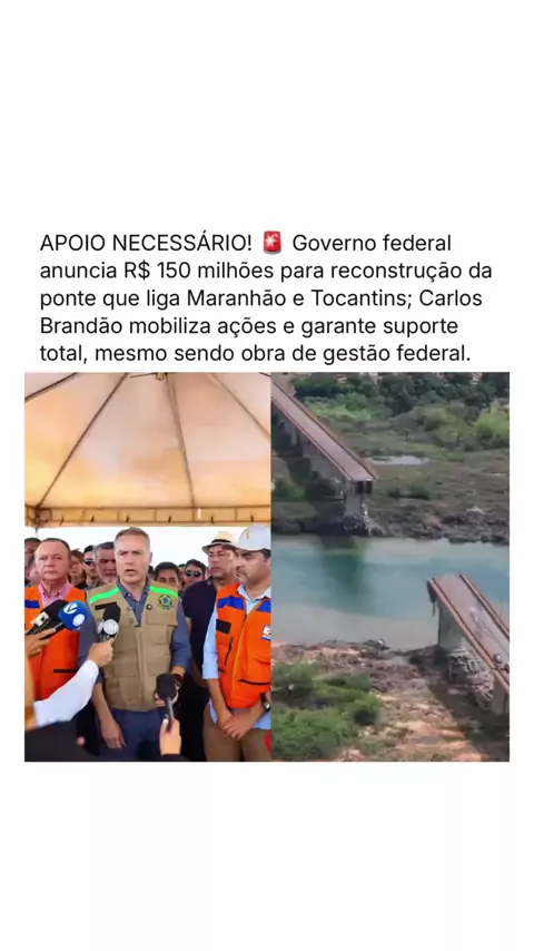 Após o colapso da ponte que liga Maranhão e Tocantins, o governo federal, responsável pela infraestrutura, já anunciou investimentos de até R$ 150 milhões para a reconstrução. A estimativa é que as obras comecem ainda em 2024, com entrega prevista para 2025. Enquanto isso, o governador Carlos Brandão (@carlosbrandaoma) segue mobilizando equipes estaduais para dar suporte às operações de resgate, atendimento às vítimas e contenção de danos ambientais. Corpo de Bombeiros, Polícia Militar e Civ...