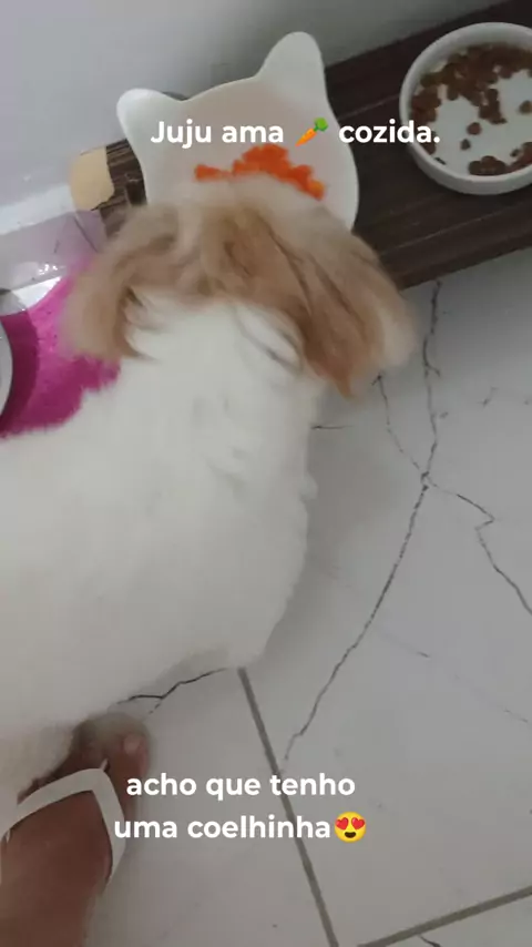 Juju ama cenoura. cenoura rica em vitamina A,Ajuda na saúde,da pele, imunidade,visão. ela ama banana,maçã. tudo tem que ser dado com moderação nada de exagero. Juju come racão.