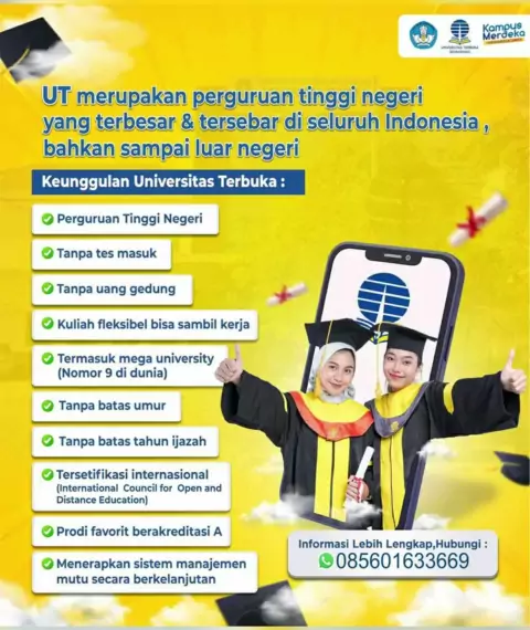 Anak kuliah kalau mau lulus harus bikin skripsi dulu ya? Eh tapi kamu tahu gak sih FAKTANYA di Universitas Terbuka kamu bisa lulus loh tanpa ngerjain skripsi. Yeaay Makanya, yuk segera bergabung di UT! Semua Bisa Kuliah di Kampus Negeri Fleksibel Kuliahnya✨, Terjamin Kualitasnya, Murah Biayanya,Tanpa Tes Masuk Daaan...Informasi ini jangan berhenti di kamu. Ayo share informasi ini ke seluruh Indonesia yaa.. #UniversitasTerbuka #KuliahOnline #KampusNegeri #KuliahFleksibelSesuaiGayamu