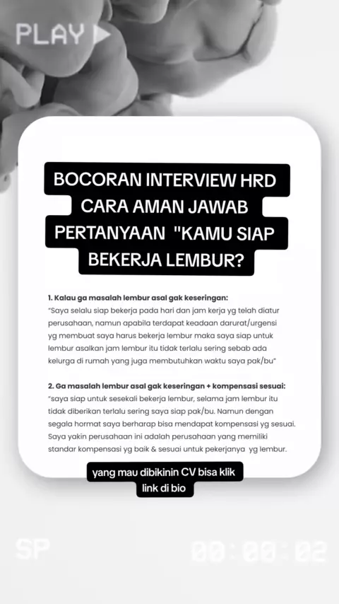 ditanya HRD pas interview kerja "kamu siap bekerja lembur?" jawab gini biar lolos interview #tipsinterviewkerja #tipswawancarakerja #interviewhr #interviewhrd #wawancarahrd #interviewkerja #wawancarakerja #tipshrd #freshgraduate #tipsfreshgraduate #tipsketerimakerja #diterimakerja #keterimakerja #hrdindonesia #lolosinterview #strategilolosinterview #tipslolosinterview #caralolosinterview #tipsketerimakerja #lolosinterviewkerja #interviewfreshgraduate #jagointerviewkerja #contekkaninterviewkerja...
