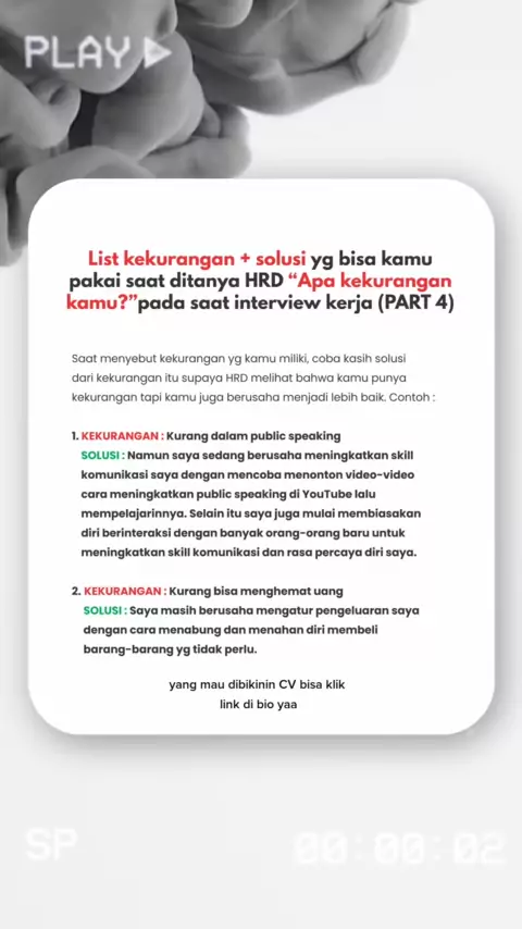 hrd pas interview kerja nanya "apa kekurangan kamu?" terus kamu bakal jawab apa? hmm gausah bingung, jawab aja pakai cara ini biar gampang menyebut kekurangan kekurangan kamu#tipsinterviewkerja#tipswawancarakerja#interviewhr#interviewhrd#wawancarahrd#interviewkerja#wawancarakerja#tipshrd#freshgraduate#tipsfreshgraduate#tipsketerimakerja#diterimakerja#keterimakerja#hrdindonesia#lolosinterview#strategilolosinterview#tipslolosinterview#caralolosinterview#tipsketerimakerja#lolosinterviewkerja#inter...