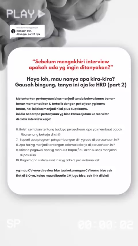 Membalas @nggaboyeh kalau HRD bilang "sebelum mengakhiri interview apakah ada yg ingin ditanyakan?" kamu mau tanya apa kira kira ke HRD kalau ditanya apakah ada pertanyaan di akhir interview kerja?#tipsinterviewkerja#tipswawancarakerja#interviewhr#interviewhrd#wawancarahrd#interviewkerja#wawancarakerja#tipshrd#freshgraduate#tipsfreshgraduate#tipsketerimakerja#diterimakerja#keterimakerja#hrdindonesia#lolosinterview#strategilolosinterview#tipslolosinterview#caralolosinterview#tipsketerimakerja#lo...