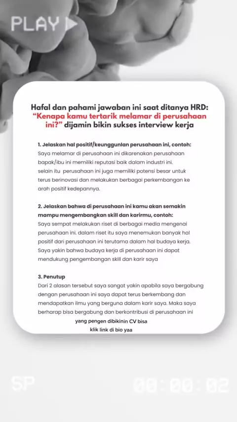 cara jawab pertanyaan HRD "kenapa kamu tertarik melamar di posisi ini?" pada saat interview kerja#tipsinterviewkerja#tipswawancarakerja#interviewhr#interviewhrd#wawancarahrd#interviewkerja#wawancarakerja#tipshrd#freshgraduate#tipsfreshgraduate#tipsketerimakerja#diterimakerja#keterimakerja#hrdindonesia#lolosinterview#strategilolosinterview#tipslolosinterview#caralolosinterview#tipsketerimakerja#lolosinterviewkerja#interviewfreshgraduate#jagointerviewkerja#contekkaninterviewkerja#carainterviewker...