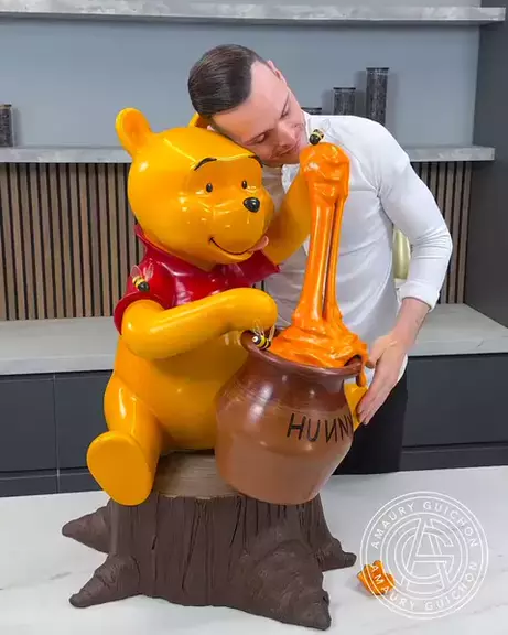 Esta criação de chocolate dá vida ao amado Winnie the Pooh, inteiramente esculpido a partir de chocolate. Do frasco de mel transbordando bondade dourada às delicadas abelhas artesanais com açúcar, cada detalhe captura o capricho e o charme deste personagem icônico. #culinaria #chocolate #viral #viraliza #arte