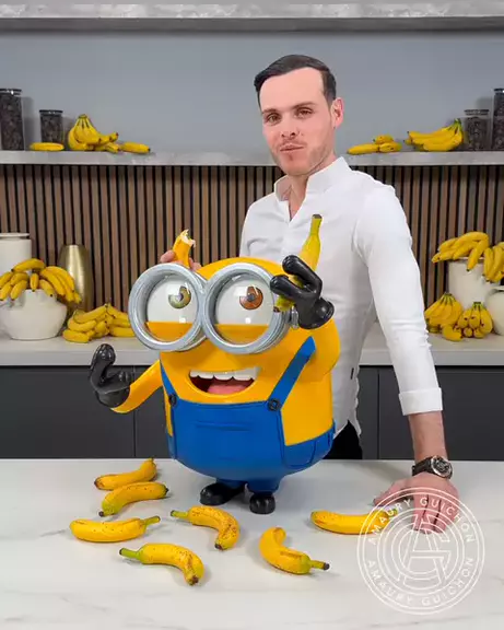 Conheça Bob, o pequeno Minion mais doce, completo com uma banana doce disfarçada. 🍌💛 Esta criação reúne várias técnicas icônicas: cúpulas de açúcar para os seus copos, a casca de chocolate mergulhada em balão e uma banana totalmente esculpida recheada com texturas e sabores em camadas. Dentro da banana: streusel crocante de noz-pecã, pão de banana, caramelo de banana macio, mousse de banana leve e uma delicada camada de chocolate branco de tom amarelo. #culinaria #chocolate #viral #viraliza
