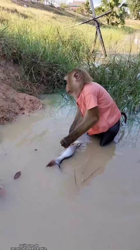 O macaco pegou um peixe grande.