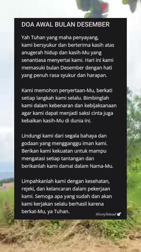 Bagian 729 | Kami berdoa semoga bulan Desember ini menjadi waktu yang penuh berkat bagi kami dan semoga kami selalu dapat menjadi terang bagi sesama di sekitar kami. Amin#Hapsun#doakristen#doahariini#doapagi#doaawalbulan#desember#syalom#anaktuhanyesus##gerejaprotestan#kristenprotestan#talaud#storytalaud🕊️#rohani#ayatalkitab#yesuskristus#terimakasihtuhan#godbless#Gbu#storyrohanikristen#kontenrohanikristen#rohani_kristen#saatteduh#doa゚