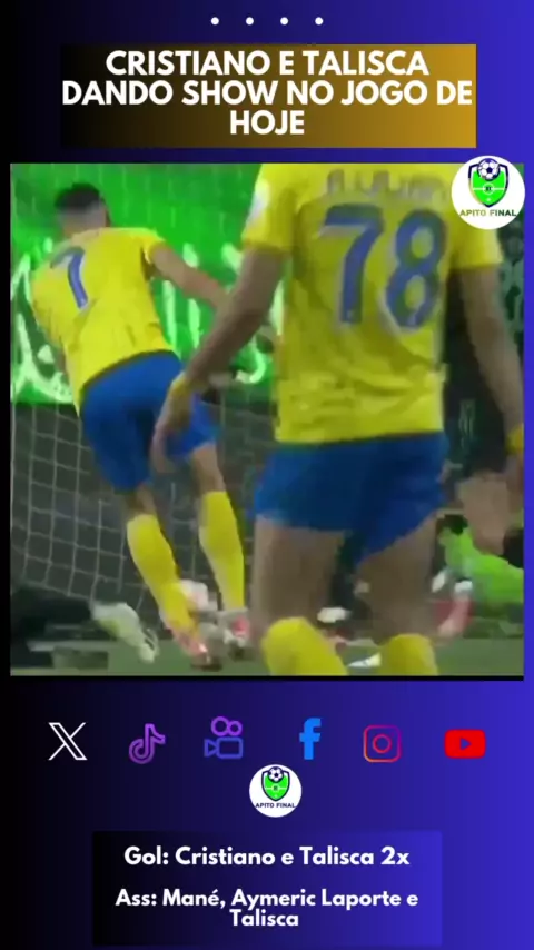 Confira os gols de hoje entre Al-Nassr vs Al-Ahli. Bela partida de Cristiano Ronaldo e A.Talisca na vitória por 4x3 em um confronto direto do time de Mahrez, R.Firmino e companhia. Que jogãooo... Golaço de Cristiano e Talisca!!! Será que essa dupla está entrosada?? Autores dos gols: Al-Nassr: ⚽️ C. Ronaldo 4', 52' ⚽️ A.Talisca 17', 45+6' Al-Ahli: ⚽️ F. Kessie 30' ⚽️ R. Mahrez 50' (P) ⚽️ F. Albrikan 87' #cristiano #cristianoronaldo #cr7 #alnassr #arabia