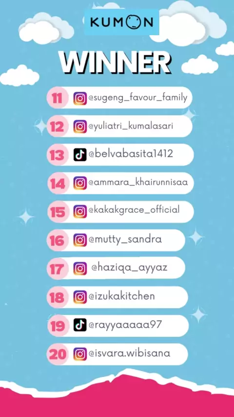 ❗UPDATE NAMA 40 PEMENANG MY KUMON JOURNEY ❗ Hai Kumoners Sebelumnya kami mohon maaf atas kekeliruan dalam penulisan salah satu nama pemenang yang mendapatkan hadiah Clutch Bag Eksklusif. Berikut update 40 Pemenang Clutch Bag Eksklusif dari kegiatan My Kumon Journey. Perubahan nama sudah kami beri tanda bintang di sebelah nomor pemenang ya. Yeeeyy selamat ya 🥳🥳, untuk mendapatkan hadiahnya pastikan kamu menghubungi DM Kumon Indonesia yaa.#kumon#kumonindonesia#cobagratiskumon #beyon...