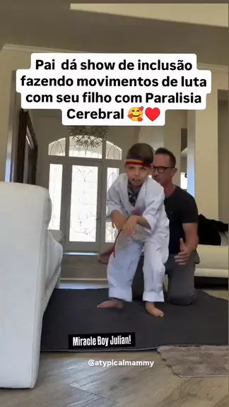 Ele veste o kimono, mas é o amor do pai que o faz lutar. Cada movimento é mais que força: é entrega, parceria e superação 🥋❤️ #PraCegoVer : Garoto com paralisia cerebral veste kimono branco. O pai, agachado no chão, levanta o filho pelas pernas, simulando movimentos de luta em uma cena ispiradora 📽️ Créditos do vídeo: robhighum #ParalisiaCerebral #AmorDePai #SuperacaoInfantil #InclusaoImporta
