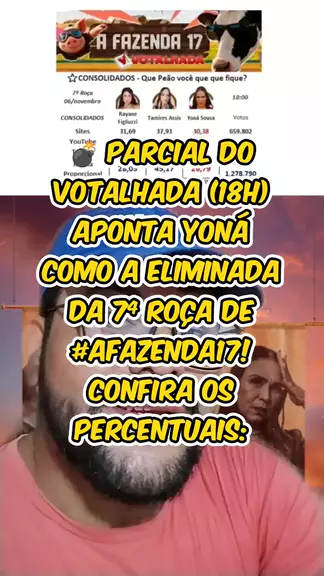 💣 Parcial do Votalhada (18h) aponta Yoná como a eliminada da 7ª Roça de #AFazenda17! Confira os percentuais: #duducamargo #eliminaçãoafazenda #rocaafazenda #ProvaDoFazendeiro