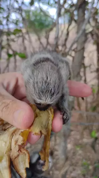 Olha fome do filhote de sagui, estava comendo a casca da banana.