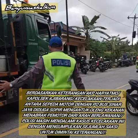 BERDASARKAN KETERANGAN AKP HARYATMO/ KAPOLSEK AJIBARANG/ KECELAKAAN TERJADI ANTARA SEPEDA MOTOR DENGAN PO BUS SINAR JAYA DIDUGA SOPIR MENGANTUK OLENG KEKANAN MENABRAK PEMOTOR DARI ARAH BERLAWANAN// POLISI MASIH MENDALAMI KASUS KECELAKAAN INI DENGAN MENGUMPULKAN SEJUMLAH SAKSI UNTUK DIMINTAI KETERANGAN//.