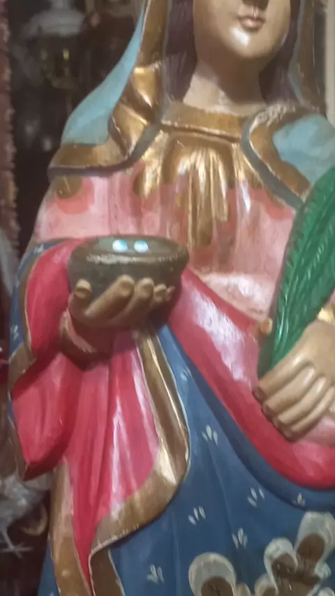 belíssima, grande e antiga escultura em madeira nobre, lindamente policromada, representando SANTA LUZIA. Olhos de vidro mefidas: 72cm de altura Valor: 3400,00 #decoraçãodeinteriores #designerdeinteriores #esculturasartisticas #madeiraentalhada #madeiranobre