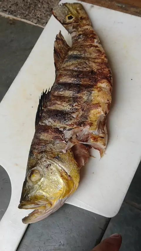 Tucunaré na brasa com escama para proteger a carne. #bãomuitobão #peixenabrasa #peixeassado