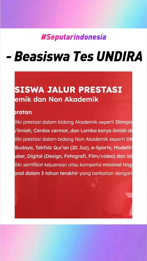 Dalam memperingati HUT kemerdekaan Republik Indonesia, Universitas Dian Nusantara berkomintmen memberikan kesempatan bagi putra-putri Indonesia yang memiliki prestasi ataupun minat dan bakat di bidangnya. . Kami memberikan spesial beasiswa dengan 3 kategori yang dapat menyesuaikan minat dan bakat yang dimiliki, seperti : - Beasiswa Jalur Prestasi Akademik dan Non Akademik - Beasiswa Nilai Rapot - Beasiswa Tes UNDIRA . Raih prestasi dan kembangan potensi yang dimiliki dengan mendaftarkan ke website reguler.