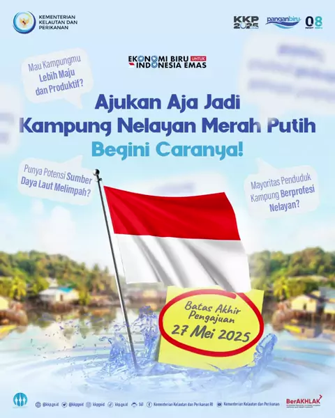 Mau kampung kamu jadi lebih maju dan produktif? Ajuin aja jadi Kampung Nelayan Merah Putih π₯ #SahabatBahari, kalau wilayah kamu punya potensi sumber daya laut yang besar dan mayoritas penduduknya adalah nelayan, kampungmu bisa diusulkan sebagai calon lokasi Kampung Nelayan Merah Putih lho! Cek cara pengajuan dan persyaratannya di infografis ini yaa. Ayo segera! Kita tunggu pengajuan kamu sampai 27 Mei 2025 πͺπ» #PanganBiru #2025KKPRiseTogether #EkonomiBiruUntukIndonesiaEmas
