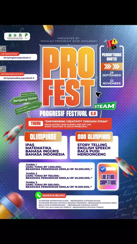 π Today is the D-DAY! π The wait is finally overβ Profest 5.0 is here! π Bring your best energy, showcase your talent, and letβs make this festival an unforgettable celebration of creativity and achievement! π‘β¨#sekolahprogresifbumishalawat#profestfivepointzero#progresiffestivalfivepointzero#STEAM#bumishalawat https://www..com/p/DPL8Cj7Cd-x/?igsh=MXBrZGwxZnhoMDJjbA==