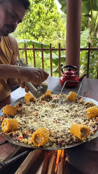 Almoço na roça, bora? Para essa receita usamos: 1 kilo de fraldinha 300 g de bacon Arroz Alho poro Cebola Alho Coentro caroço Milho Pimenta biquinho Sal (A fraldinha fica 1 hora na panela de pressão) #arrozdefraldinha #almoço #janta #discodearado #fogaoalenha