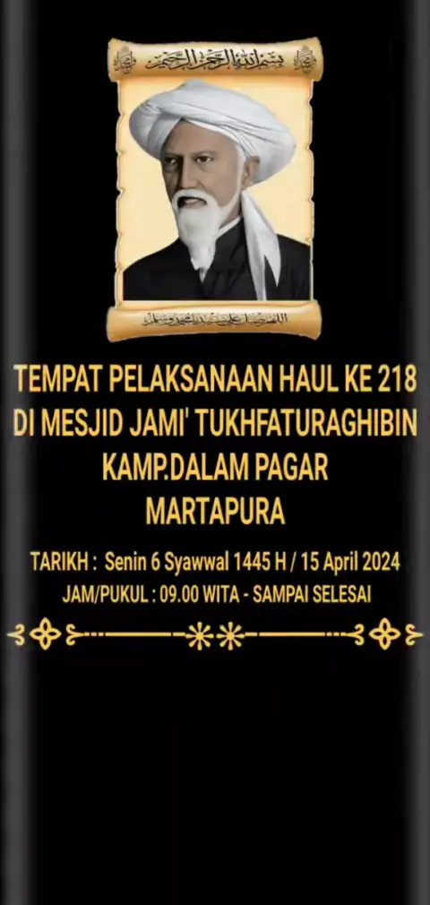 Peringatan Haul ke-218 (2024) "Datuk Sheikh Muhammad Arsyad Al-Banjary " Pada Senin 6 Syawwal 1445 H/15 April 2024. Jam/Pukul : 09.00 Wita - Sampai Selesai. Inshaa'Allah bertempat di Mesjid Jami' Tuhfaturraghibin di Kamp.Dalam Pagar Martapura.#Haul218#DatukKelampayan#DatuKelampayan#DatukSheikhMuhammadArsyadAlBanjary#4SerangkaiDariTanahJawi#TuanHajiBesar#KampungDalamPagar#Martapura#KalimantanSelatan#UlamaBanjar#UlamaAlamMelayu#UlamaNusantara#UlamaKalimantan#UlamaAsiaTenggara#Kelampayani##U...