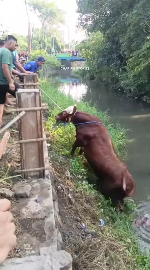 Viral❗️Sapi kurban nyemplung kali. Sapi kurban di Dusun Unggahan, Desa Banjaragung, Kecamatan Puri, Kabupaten Mojokerto, kabur dari ikatan, Jumat (6/6) pagi. Sapi berbobot setengah ton itu diduga stres lalu terlepas saat warga menggelar salat Ied. Sedianya sapi yang hendak dikurbankan jemaah Musala Al-Huda tersebut sempat lari dan merobohkan tembok kemudian masuk ke sungai sedalam tiga meter. Evakuasi sapi yang berlangsung selama 1 jam melibatkan tim Damkar Kabupaten Mojokerto akhirnya membu...