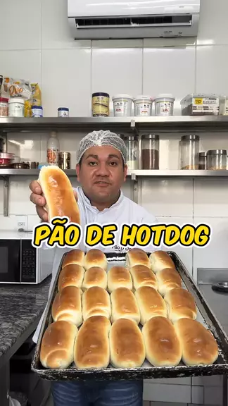 Pão de Hot Dog Em uma vasilha, 1kg farinha, 200g açúcar, 20g sal, 3 ovos, 10g leite em pó, 100ml leite, 60g gema de ovo, 60g margarina, 60g fermento fresco, 400ml água gelada e misture bem Corte a massa em pedaços de 90g, abre a massa e enrole como mostrado no vídeo Deixe descansar por 1 hora Forno 200 graus por 15 minutos #pao #hotdog #Receita