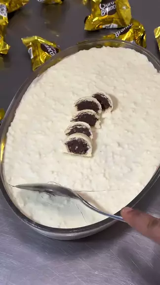 Bombom Ouro na Travessa 🤤🍫 Esse bombom é um verdadeiro tsunami de sabor e cremosidade! Uma opção perfeita para deixar a sua Páscoa ainda mais especial. 😋 Ingredientes: • 2 caixas e meia de leite condensado (790g) • 4 caixas de creme de leite (800g) • Chocolate ao leite – 150g • Chantilly batido em ponto firme – 260g (130g para cada base) • 14 bombons Ouro Branco (aprox. 490g) • Chocolate branco – 250g • Flocos de arroz – 30g #bombomnatravessa #ourobranco #cremoso #creme #bombom