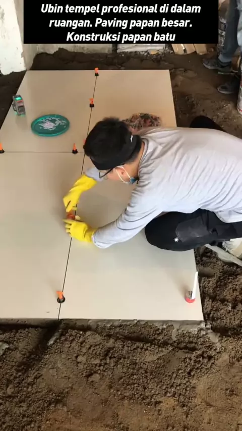 Ubin tempel profesional di dalam ruangan. Paving papan besar. Konstruksi papan batu