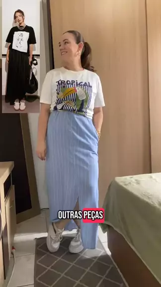 “A referência era saia com T-shirt… mas eu adaptei com o que eu tinha: um vestido e uma T-shirt! Moda é isso: inspiração, criatividade e identidade.” #77LIQUIDA #fy #MODA #pinterest