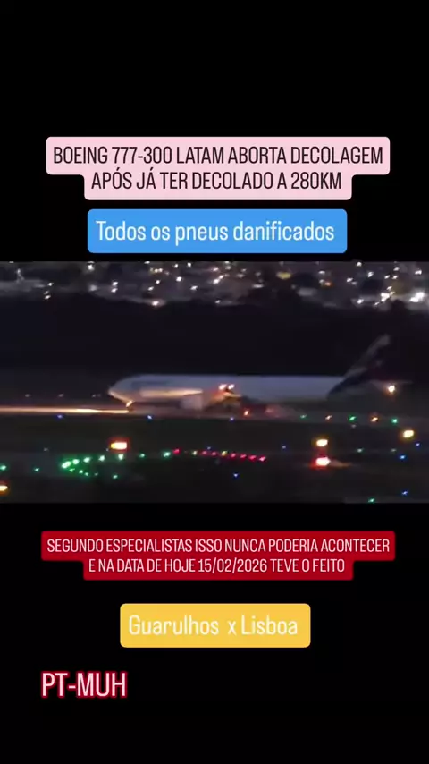 um acontecimento raríssimo que aconteceu nesse início da noite no aeroporto internacional de Guarulhos aeronave da latam Boeing 777 300 com destino a Lisboa já correndo na decolagem com nariz levantado abortou a decolagem Pegou spotter do canal @luck_a892 de surpresa muito se debate numa decolagem em termos de segurança aonde pode ou não pode abortar uma decolagem E hoje foi um caso que aconteceu atípico desse latão como mostra o vídeo #777 #latam #Guarulhos