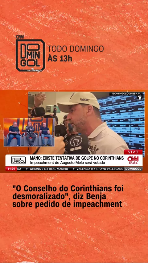“AGIRAM SEM A MENOR INTELIGÊNCIA” No #DomingolcomBenja, o apresentador @benjaminbackoficial comentou sobre o pedido de impeachment contra o presidente do Corinthians, Augusto Melo, e afirmou que o Conselho Deliberativo do Timão “errou o timing” ao mover a ação. E aí, concorda com o Benja? #CNNEsportes #Corinthians #Impeachment #Futebol