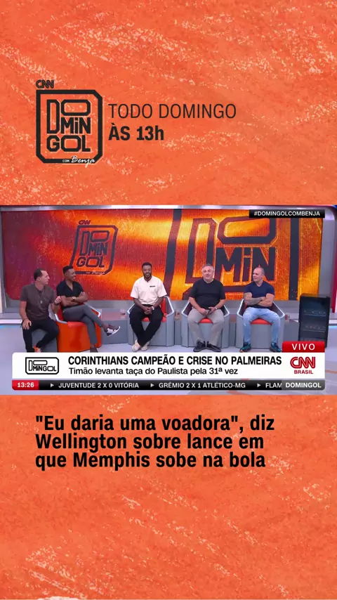 IRIA CHEGAR FORTE 😳 Convidado do #DomingolcomBenja deste domingo (30), o volante Wellington afirmou que, caso estivesse em campo, “daria uma voadora” em Memphis, no lance em que o atleta corintiano sobe na bola durante a final contra o Palmeiras. #CNNEsportes #CNNBrasil #CNNAoVivo #Memphis
