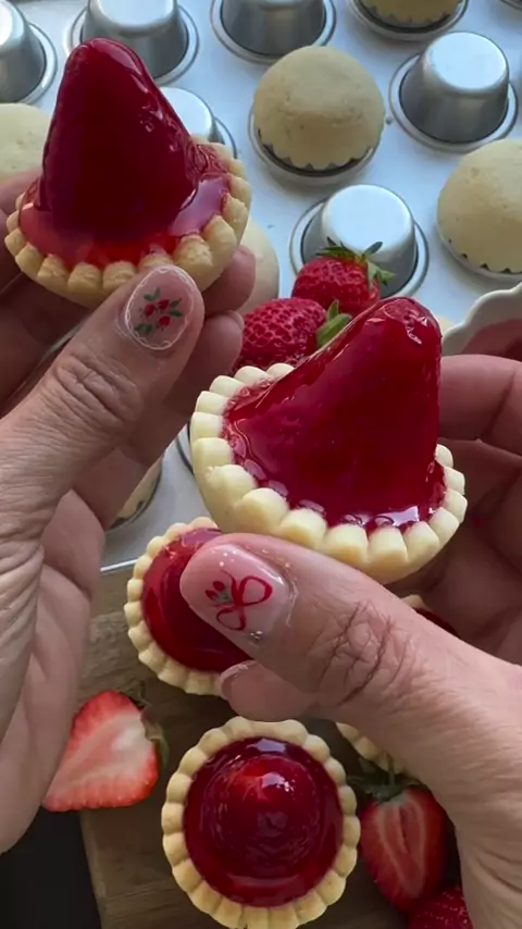Tortinhas de Morango Aqui está a minha versão de verão da dica de tortas em forma de muffin invertida: minitortinhas de morango feitas com massa folhada dourada e crocante, recheadas com creme de mascarpone sedoso e coroadas com um morango suculento inteiro coberto com calda de morango 🍓✨ É uma maneira fácil de criar sobremesas pequenas que parecem dignas de confeitaria, mas não precisam de formas sofisticadas! Basta virar a forma de muffin, moldar a massa sobre o fundo e assar — sem untar,