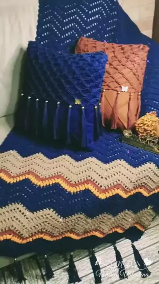 Manta de Sofá+Almofadas🥰Tom Azul Marinho 💙 com Tons terrosos🤎🤎com franjas..✨✨ #mantadecroche #crocheparaolar #viralvideos #crochehome #crochetdesigner