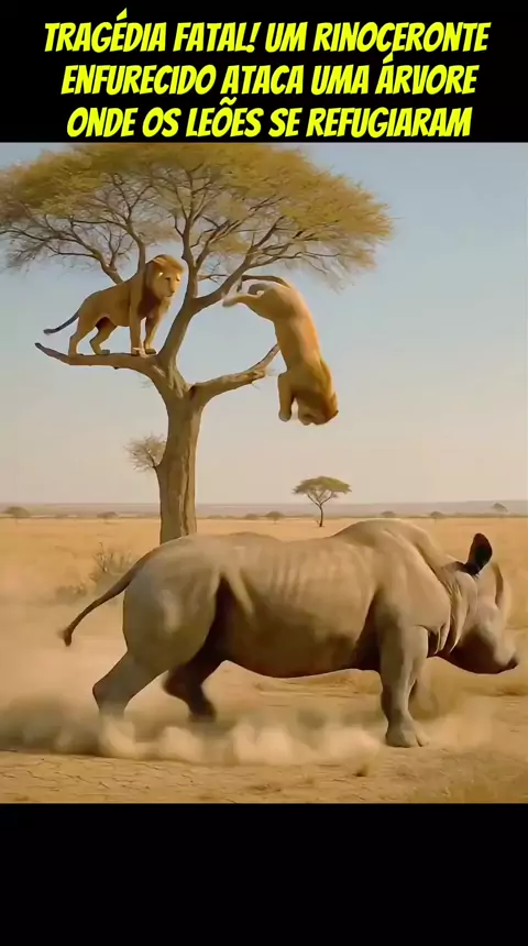 *TRAGÉDIA FATAL! Um rinoceronte enfurecido ataca uma árvore onde os leões se refugiaram.