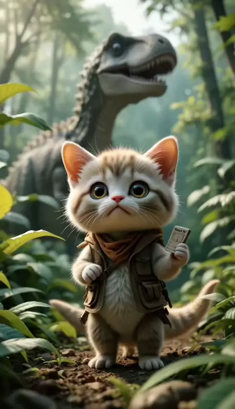 Gatinho aventureiro 🥰 #cute #kitty #dinossauro #aventura #ai