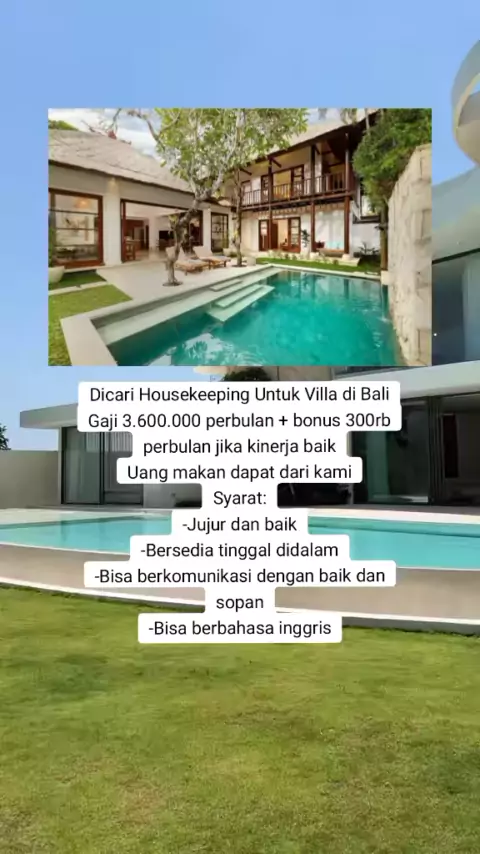 Dicari Housekeeping Untuk Villa di Jimbaran, Bali Gaji 3.600.000 perbulan + bonus 300rb perbulan jika kinerja baik Uang makan dapat dari kami Syarat: -Jujur dan baik -Bersedia tinggal didalam -Bisa berkomunikasi dengan baik dan sopan -Bisa berbahasa inggris#loker#loker2024#lowongankerja#lowongankerja2024#lokerterbaru#villa#bali