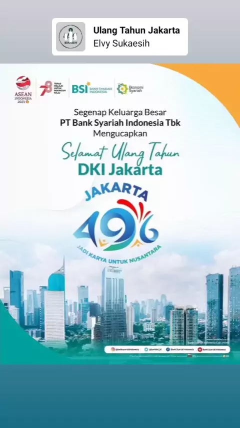 banksyariahindonesia Segenap keluarga besar PT Bank Syariah Indonesia Tbk mengucapkan selamat ulang tahun untuk Kota Jakarta yang ke-496 tahun. Semoga semakin jaya dan menjadi karya untuk nusantara. #BankSyariahIndonesia #HUTJakarta496 #TumbuhSeimbangDanBerkelanjutan