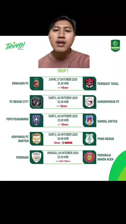 Jumat, 17 Oktober β Minggu, 19 Oktober 2025 Dari Sriwijaya FC vs Persekat Tegal sampai PSIS Semarang vs PSS Sleman #PegadaianChampionship #Liga2Indonesia #Gameweek6 #SepakBolaIndonesia