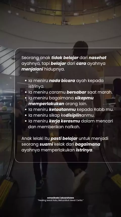Anak nggak belajar dari kata-kata ayahnya, tapi dari caranya menjalani hidup. 🌿 Dari nada bicara ayah ke ibunya, dari sabarnya saat marah, dari caranya menghormati orang lain. Anak lelaki belajar jadi suami, dari bagaimana ayah memperlakukan ibunya. Dan anak perempuan belajar mencintai dirinya, dari bagaimana ayah mencintai ibunya. Ayah bukan cuma kepala keluarga, tapi juga guru pertama tentang cinta dan hormat. 🤍 🕊️ Peluk ayahmu hari ini, sebelum semua jadi kenangan. Tag sosok ayah yang jad...