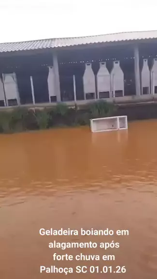 Geladeira boiando em alagamento após forte chuva em Palhoça SC 01.01.26