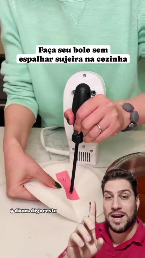 Não faça mais bagunça na cozinha na hora de bater seu bolo!! ⚠️ Segue a dica: • Pegue um pedaço de uma fita, coloque onde fica os furos da batedeira e faça a marcação, depois pegue um prato de isopor ou plástico e use a fita com a marcação para fazer o furo no prato, aí é só encaixar os batedores nos furos do prato e encaixar na batedeira. Dessa forma vai evitar que respingue os ingredientes na sua bancada e cozinha. Gostou?? 👍Curte, 💬Comenta e ↗️Compartilha. #bolo #batedeira #ingredientes